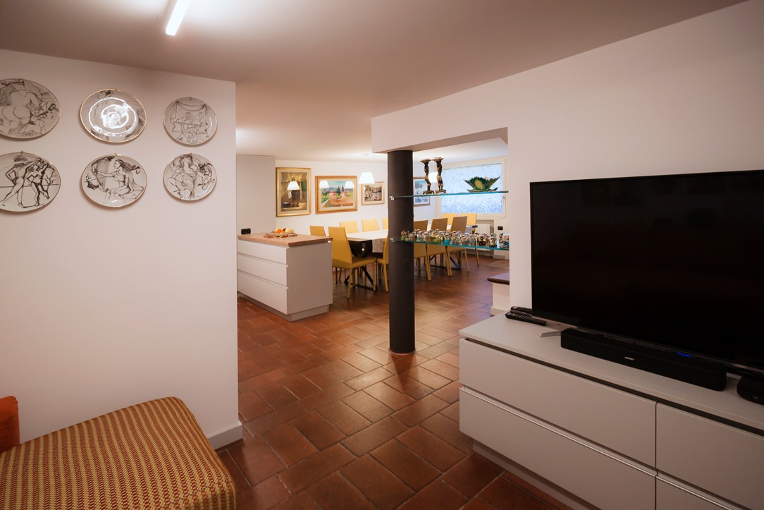 Della stessa finitura della cucina, per mantenere una continuità stilistica, è stato laccato anche il mobile Tv del salottino relax, che si posiziona nella parte più intima e nascosta della taverna.