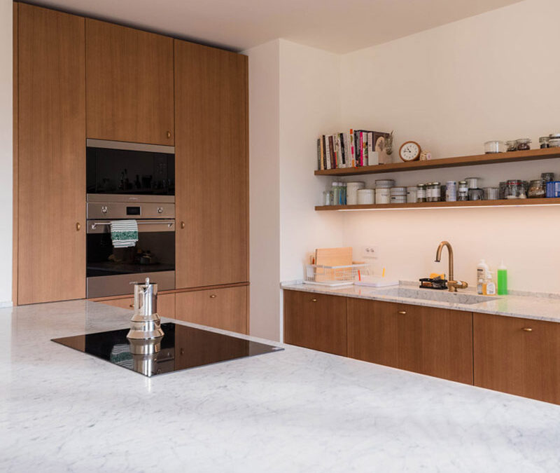 A kitchen in brushed-stained oak with a Carrara marble worktop dominates the bright living area of a Milanese penthouse. The peninsula unfolds in all its grandeur, interacting with the space in front of it through a rhythmic sequence of recessed doors with push-to-open mechanisms and internal shelves. It houses the hob and is softened by external radiating lines that extend from the Carrara marble worktop onto the fixed side panel in stained oak.