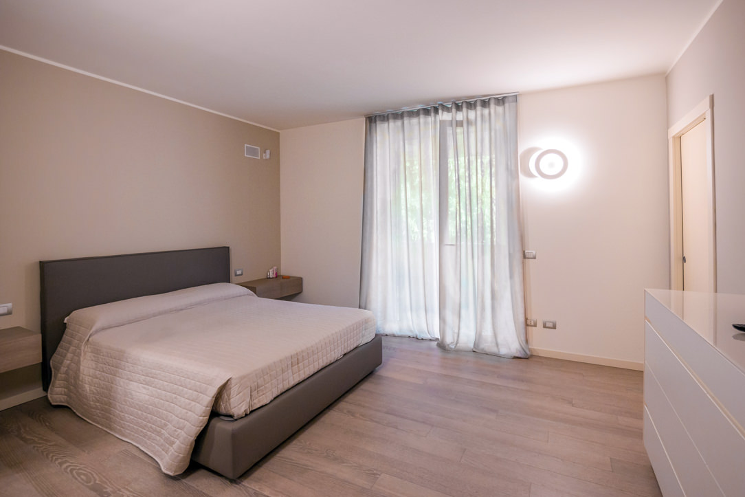 La camera da letto rinuncia alle tonalità scure favorendo i toni neutri del rovere tinto bronzo, accompagnato da una cassettiera bianca con piano in Lacobel. Ultima la cabina armadio che si sviluppa sui quattro lati della stanza adiacente, caratterizzata da elementi appenderia e ripiani in legno bilaminato effetto tessuto. Al centro, illuminata da una lampada a plafone che scende dal soffitto, una cassettiera apribile da entrambi i lati. Ripiani estraibili in cristallo e maniglie ad incavo in alluminio sottolineano l’attenzione ai dettagli.