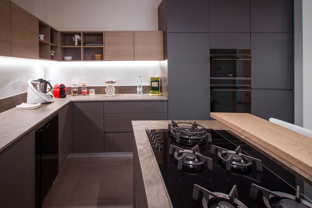 Disposta ad angolo, la cucina è dotata di un’isola cottura centrale con piano snack in rovere, abbinato ai pensili superiori. Le ante dei volumi inferiori caratterizzano con toni scuri la cucina mentre il piano in Dekton Kira Natural, opaco e leggermente venato, confluisce nel lavabo su misura mostrandosi nella sua eleganza. Sul retro della cucina il Lacobel bianco illuminato dai led sottopensile schiarisce l’ambiente. Gli elettrodomestici in vetroceramica nera, della serie Dolce Still Novo di Smeg si uniformano al piano cottura e alla cappa downdraft incassata fronte fuochi.
