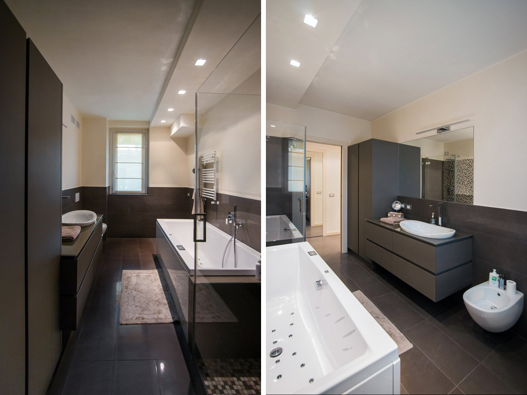 Attraverso un corridoio dalle pareti intonacate bianche e porte color panna laccate lucide si accede alla zona notte. Qui, il bagno ospiti grigio scuro riprende le tonalità della cucina con un mobile a servizio alto accompagnato da un elemento basso con top in Lacobel. Diverso invece il bagno padronale, dove il piano in marmo Emperador dark del mobile basso attrezzato è sovrastato da uno specchio con lampadine incassate dal bordo in acciaio.